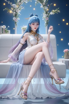 A serene 8K photo of a girl (GG) Lazily is sitting on top of a white couch. There are books on a shelf to the left of the woman. Part of a tree can be seen outside of the window. long hair, hair ornament, full body, flower, high heels, legs, bare legs, spread legs,cross legs.