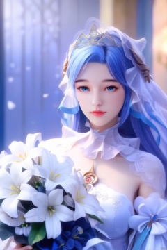 1girl, solo, long hair, blue eyes, hair ornament, dress, holding, blue hair, upper body, flower, indoors, white dress, looking at viewer, tiara, veil, bouquet, wedding dress, bride
