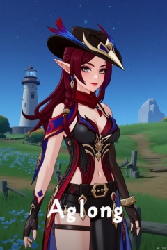 A beautiful female elf with long, wavy maroon hair tied in a braid, wearing a stylish black hat with blue and red feathers, a red scarf, and a revealing, intricately - designed black and red outfit with blue accents. She stands in front of a pastoral scene with green grass, blooming plants, and a distant lighthouse against a starry night sky. (一位美丽的女性精灵,有着长长的、波浪状的栗色头发编成辫子,戴着一顶有蓝红羽毛装饰的时尚黑帽,围着红色围巾,穿着一套露肤且设计复杂的黑红相间并带有蓝色点缀的服装。她站在一幅田园风光前,绿草如茵,繁花盛开,远处有一座灯塔,背景是繁星点点的夜空。)qsk,The text "AGlong" is in the middle below the poster