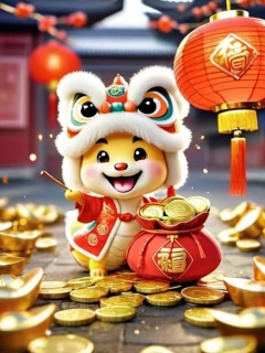 shenian,coin,hat,open mouth,chinese new year,lantern,smile,looking at viewer,brown eyes,blush,paper lantern,solo,<lora:shenian:0.8>,, masterpiece, best quality,