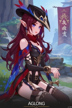 Anime style,1girl, solo, long hair,A beautiful female elf with long, wavy maroon hair tied in a braid, wearing a stylish black hat with blue and red feathers, a red scarf, and a revealing, intricately - designed black and red outfit with blue accents. (一位美丽的女性精灵,有着长长的、波浪状的栗色头发编成辫子,戴着一顶有蓝红羽毛装饰的时尚黑帽,围着红色围巾,穿着一套露肤且设计复杂的黑红相间并带有蓝色点缀的服装。)Sitting on a stone,qsk,The text "AGlong" is in the middle below the poster,Noyu,幻彩光影特效2.5D-Flux, colorful