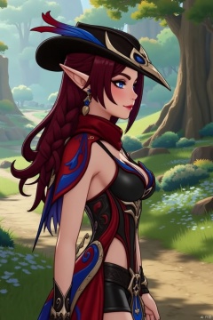 A beautiful female elf with long, wavy maroon hair tied in a braid, standing in a serene forest glade. She wears a stylish black hat adorned with blue and red feathers, a red scarf, and a revealing, intricately designed black and red outfit with blue accents. The scene is softly lit by dappled sunlight, highlighting her graceful pose and the intricate details of her attire.