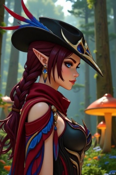 A beautiful female elf with long, wavy maroon hair tied in a braid, wearing a stylish black hat with blue and red feathers, a red scarf, and a revealing, intricately designed black and red outfit with blue accents. The scene is framed in a close-up shot, with soft, warm lighting enhancing her elegant features. She stands confidently in a mystical forest, surrounded by ancient trees and glowing mushrooms, her pose exuding grace and mystery.
