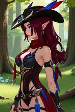 A beautiful female elf with long, wavy maroon hair tied in a braid, standing elegantly in a forest glade. She wears a stylish black hat adorned with blue and red feathers, a red scarf draped around her neck, and a revealing, intricately designed black and red outfit with blue accents. The scene is softly lit by dappled sunlight, highlighting her graceful pose and the intricate details of her attire.