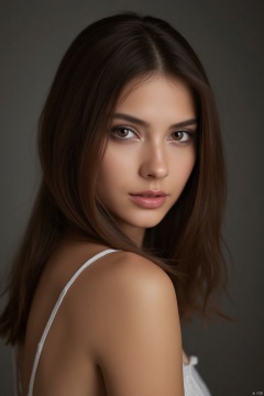 A solo portrait of a young woman with long, brown hair cascading down her back and bare shoulders. Her piercing brown eyes lock onto the viewer's gaze as she confidently stands, her small breasts subtly defined beneath her skin. A delicate collarbone and toned upper body are showcased. Her lips are slightly parted, inviting attention to her striking features. A strap slips down one shoulder, drawing the viewer's focus to the gentle curve of her breast.,Light Master