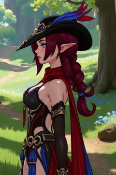 A beautiful female elf with long, wavy maroon hair tied in a braid, standing in a serene forest clearing. She wears a stylish black hat adorned with blue and red feathers, a red scarf, and a revealing, intricately designed black and red outfit with blue accents. The scene is softly lit by dappled sunlight, highlighting her graceful pose and the intricate details of her attire.
