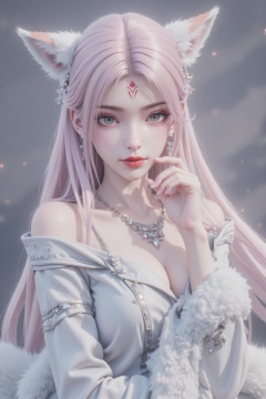 Fox Girl Portrait: A stunning fox girl with long, multicolored hair featuring pink and white hues, adorned with earrings and a necklace. Her piercing grey eyes gaze directly at the viewer as she wears a subtle facial mark and sports a closed-mouth expression. Her upper body is showcased in wide sleeves, accentuating her slender figure. Fox ears protrude from her head, fluffed with a soft, furry texture. A long tail swishes behind her, completing her whimsical appearance. A hand rests on her cheek, highlighting her delicate features. The background is blurred, focusing attention on the subject's captivating presence.