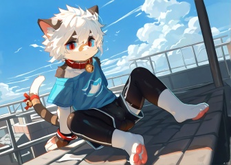 cat boy,1boy,solo,male_focus,(white_hair:0.8),red eyes,[bell on collar,Collar,Cortical collar,Large collar],(blue t-shirt,black_leggings under shorts,black bike_shorts),(barefoot) BREAK dutch angle,vanishing point,sitting on rooftop,(blue sky,cloud,wind),(masterpiece, best quality:1.1),foot focus,bandage on nose,bandage on leg,Tail decoration,cat tail,PVC Style,bare_shoulder,body fur,furry,Akira