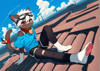 cat boy,1boy,solo,male_focus,(white_hair:0.8),red eyes,[bell on collar,Collar,Cortical collar,Large collar],(blue t-shirt,black_leggings under shorts,black bike_shorts),(barefoot) BREAK dutch angle,vanishing point,sitting on rooftop,(blue sky,cloud,wind),(masterpiece, best quality:1.1),foot focus,bandage on nose,bandage on leg,Tail decoration,cat tail,PVC Style,bare_shoulder,body fur,furry,Akira