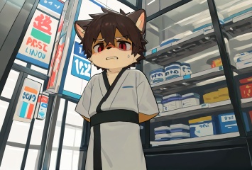 1boy,convenience store,kimono,shota,disgust,furry,from_below,
