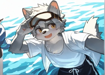 masterpiece,best quality,solo,by milkytiger1145,by littleblackalas,anime style,furry,Wolf,white shirt,open clothing,swimming trunks,swimming goggles, (looking aside:1.2),floating,upper body,selfie,onnk,source_furry,anthro,body fur,Akira