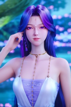 1girl, solo, long hair, looking at viewer, dress, bare shoulders, jewelry, blue hair, purple eyes, upper body, purple hair, braid, multicolored hair, parted lips, necklace, white dress, two-tone hair, blurry background, watermark, forehead jewel