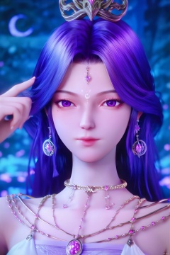 1girl, solo, long hair, looking at viewer, jewelry, closed mouth, purple eyes, purple hair, earrings, necklace, mole, lips, mole under eye, crescent, gem, portrait