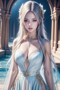 extremely detailed, 1girl, solo, long hair, jewelry, hair ornament, necklace, breasts, cleavage, original, dress, looking at viewer, feathers, pale skin, wavy hair, white hair,