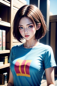 1girl,standing,upper body,(t-shirt:1.2),short hair,facial highlights,pure beauty,
