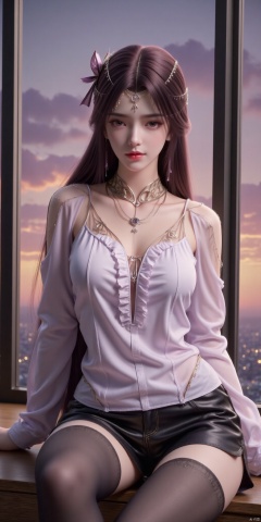 1girl, solo, thighhighs, long_hair, sitting, window, single_thighhigh, brown_hair, long_sleeves, shirt, frills, white_shirt, brown_eyes, black_shorts, black_thighhighs, sky, shorts, cloud, indoors, cityscape, hair_ornament, closed_mouth, hair_bow, bow, sunset, jewelry,yunxi