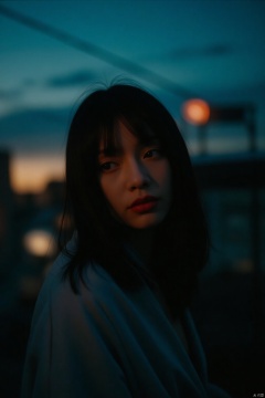 A Wong Kar Wai-inspired masterpiece! A half-body shot of a stunning young woman, captured with a Fujifilm 100mm lens, under the twilight setting's soft blue glow. Her straight, long black hair cascades down her shoulders, its layers expertly framed by the camera. Bangs veil her face, adding to the enigmatic aura. Her porcelain skin glows, high nose and full red lips exuding a cool, charming mystique. The blurred background hints at a car setting, dimly lit with an outside light source casting a warm glow. The overall color palette is understated, yet the film grain texture imbues the image with a timeless quality. In this quiet atmosphere, the subject's concept clothing and garment draping evoke a sense of sophistication and mystery.