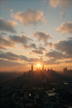A serene outdoor cityscape at sunset, with a cloudy sky illuminated by warm sunlight. The sun dips below the horizon, casting long light rays across the buildings and scenery. A majestic city skyline stands tall, with towering structures reflecting off the cloud-streaked sky. The atmosphere is tranquil, with no humans in sight to disturb the peaceful ambiance.,Light Master