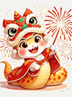 Lion dancing hats,shebaobao,The cute, chubby yellow snake is dressed in a traditional Chinese lion dance costume, with a stylish dragon head ornament and a flowing red robe. With big shiny eyes and a happy smile. With festive fireworks in the background, the whole scene is filled with joy and celebration.,<lora:she_v1:0.8>