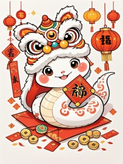 A cute, round white snake with red and orange markings wears a traditional Chinese lion mask with large expressive eyes and a smirk. It holds a red envelope with Chinese characters written on it. Around it, hung lanterns, a gold coin, and a bunch of other holiday baubles. The background is pure white, making the dragons and decorations pop in bright reds and oranges. The style is simple and playful, with bold lines and minimal details, nailed to the traditional Chinese New Year atmosphere.,<lora:she_v1:0.8>