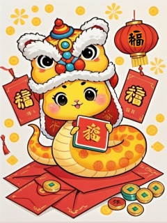 Lion dancing hats,shebaobao,The vivid digital painting depicts a cute yellow and orange snake dressed in a traditional Chinese New Year costume with a red hat and red envelopes. He was holding a red and gold card surrounded by red lanterns, gold coins and red envelopes. The background is popular with festive colors and intricate patterns.,<lora:she_v1:0.8>