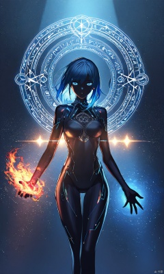 illustration, masterpiece, best quality, extremely detailed, wallpaper, 8k, mysterious, vivid color, shiny, best quality, intricate, good anatomy, beautiful lighting, 1girl, open hand, blue hair, fire, magic circle, light particles, light rays, Magic Circle, cowboy shot, wide shot, volumetric lighting, detailed eyes,