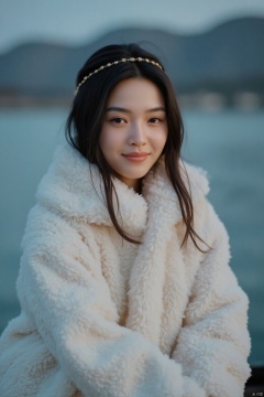 a girl for cgart_mayfly\(model\) test, in (pure white:1.5) dress, long hair cascading over her shoulders, winter hanfu, fur collar,(looking_at_viewer),smile. BREAK, adorned with a golden headband on her hair, which shone even more brilliantly in the snow. Her attire was like that of a fairy woman. she was only around 15 or 16 years old, with skin as white as snow, delicate and beautiful beyond words. BREAK,Snow, Edge lighting, the traditional Chinese boat, 35mm photograph, shot by Leica M50 f/2.8