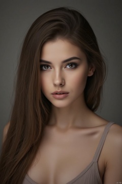 A solo portrait of a young woman with long, brown hair cascading down her back and bare shoulders. Her piercing brown eyes lock onto the viewer's gaze as she confidently stands, her small breasts subtly defined beneath her skin. A delicate collarbone and toned upper body are showcased. Her lips are slightly parted, inviting attention to her striking features. A strap slips down one shoulder, drawing the viewer's focus to the gentle curve of her breast.,Light Master