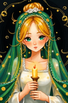 SK,SK,colorful,mineral,Illustration style, frontal composition, close-up composition, oil painting texture, green with gold, a girl wearing a green embroidered veil, with her hair in a bun, and a white wedding dress. In the picture, the girl has golden hair and blue-green eyes, holding a candle with a candlestick in her hand, the picture is dim, the background is black, gold foil, gold foil texture, panoramic composition