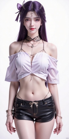 yunxi,nai3, 1girl, shorts, solo, crop top, black shorts, choker, navel, shirt, midriff, crop top overhang, looking at viewer, white shirt, jewelry, breasts, cowboy shot, bare shoulders, short shorts, off-shoulder shirt, off shoulder, black choker, thighs, stomach, hand on own thigh, long hair, bracelet, short sleeves, ribbon, hand up, collarbone, hair ribbon, medium breasts, standing, high-waist shorts, dolphin shorts, bra strap, , hair ornament, thigh gap, necklace, expressionless, , , yunxi,purple hair,purple eyes,kind smile