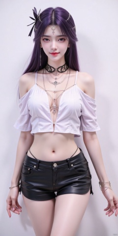 yunxi,nai3, 1girl, shorts, solo, crop top, black shorts, choker, navel, shirt, midriff, crop top overhang, looking at viewer, white shirt, jewelry, breasts, cowboy shot, bare shoulders, short shorts, off-shoulder shirt, off shoulder, black choker, thighs, stomach, hand on own thigh, long hair, bracelet, short sleeves, ribbon, hand up, collarbone, hair ribbon, medium breasts, standing, high-waist shorts, dolphin shorts, bra strap, , hair ornament, thigh gap, necklace, expressionless, , , yunxi,purple hair,purple eyes,kind smile
