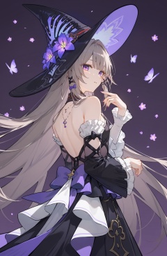 <lora:大黑塔pony:1> theherta, a girl named theherta, 1girl, bare shoulders, witch hat, black headwear, purple flower, hat flower, detached sleeves, black dress, long sleeves, backless dress, frills, bare back, witch, (score_9,score_8_up,score_7_up),(masterpiece,best quality,high quality:1.2),absurdres, prefect lighting, very aesthetic, anime BREAK