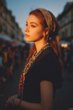 a girl,gypsy girl,wandering,complicated old clothes,(natural colors, correct white balance, color correction, dehaze,clarity),RAW photo,full sharp,wallpapper 8k uhd,dslr,soft lighting,high quality,Fujifilm XT3,european,red hair,outdoor,noisy street,a small pointed nose,at the flea market,many people gathered,beautiful,tall slim,sexy,in france,dark tone,movie screen,magazine,dressed in bohemian handmade traditional costumes,the beige lace headscarf tied up the hair,head wearing a beautiful flower,standing in the shadows,strong light and dark contrast,the body has a complicated handmade ornament necklace bracelet,long necklace with big decorations,
