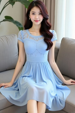 (masterpiece, best quality:1.4),finely detailed,1girl, solo, long hair, breasts, (Chiffon lace dress:1.2),short sleeves, looking at viewer, black hair,ponytail, lips,blue dress, realistic,sitting on the couch,bare feet,