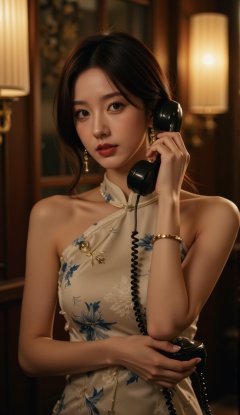 Cheongsam,Cheongsam,earrings,necklace,old-fashioned phones,warm yellow lights,