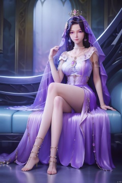 1girl, solo, long hair, breasts, looking at viewer, skirt, black hair, hair ornament, dress, jewelry, sitting, purple eyes, full body, barefoot, necklace, feet, legs, bare legs, toes, crossed legs, instrument, veil, purple dress, anklet