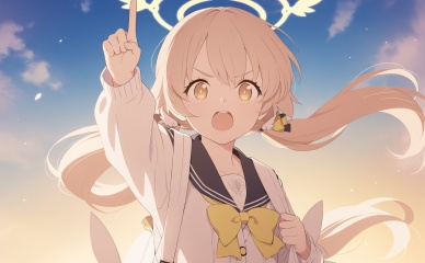 masterpiece,best quality,high quality,loli,1girl,hifumi (blue archive),solo,halo,twintails,white cardigan,pointing up,open mouth,cardigan,low twintails,pointing,long hair,sailor collar,arm up,light brown hair,yellow eyes,wing hair ornament,sky,long sleeves,upper teeth only,upper body,school uniform,blue sailor collar,black sailor collar,index finger raised,backpack,bag,teeth,bow,yellow bow,ribbon,yellow bowtie,brown hair,v-shaped eyebrows,white bag,blue sky,serafuku,looking at viewer,yellow ribbon,<lora:BA2——【Illustrious】hans:1>,