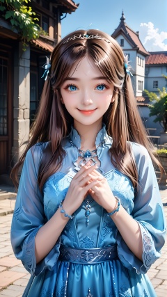 1girl,hair ornament,blue eyes,brown hair,dress,long hair,solo,smile,upper body,looking at viewer,own hands together,blue dress,bracelet,closed mouth,jewelry,sky,building,blue sky,<lora:pony宁荣荣:0.8>,