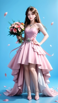 1girl, solo, flower, bouquet, brown hair, hand on hip, dress, full body, petals, long hair, tiara, holding bouquet, holding, pink dress, blue background, looking at viewer, skirt, standing, jewelry,<lora:pony宁荣荣-000008:0.8>,