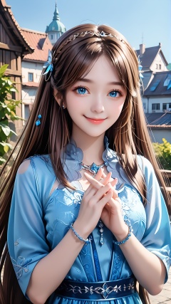 1girl,hair ornament,blue eyes,brown hair,dress,long hair,solo,smile,upper body,looking at viewer,own hands together,blue dress,bracelet,closed mouth,jewelry,sky,building,blue sky,<lora:pony宁荣荣-000008:0.7>,