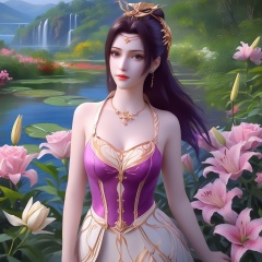 <lora:842-DA-XL-斗破苍穹-云韵-婚服:0.8>, (,1girl, ,best quality, ),,  ,ultra detailed 8k cg,ultra realistic 8k cg,1girl, solo,(bare shoulders:0.85),(masterpiece, best quality),((oil painting style)),sexy young lady,(beautiful face and eyes),(upper body:1.5),(whole body:1.05),(single person:1.2),surrounded by flowers, (lily), roses, floret, vegetation, white, purple, purplish pink,Impressionism,colorful,(Breast size:1.3),(cleavage),,