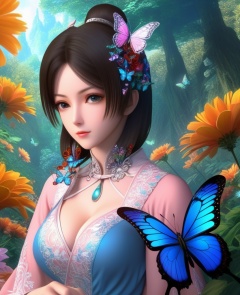 <lora:843-DA-XL-元龙-宋嫣:0.8>, (,1girl, ,best quality, ),,,anime,(masterpiece, top quality, best quality, official art, beautiful and aesthetic:1.2), (1girl)	, , (cleavage),, extreme detailed,(fractal art:1.3),colorful, flowers ,highest detailed,()    (cleavage),butterfly,  (),