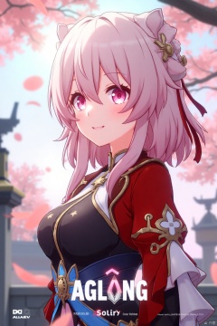 A captivating movie poster showcasing a solo girl with short pink hair, smiling with bangs and a hair ornament. She wears long sleeves, fingerless gloves, and Chinese clothes, her pink eyes reflecting the floating pink petals around her. The scene is framed with a close-up of her face, soft lighting enhancing the dreamy atmosphere. The text AGlong is prominently displayed at the bottom center of the screen.