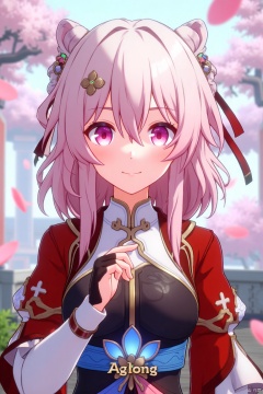 A striking movie poster featuring a solo girl with short pink hair, smiling with bangs and a hair ornament. She wears long sleeves, fingerless gloves, and Chinese clothes, her pink eyes reflecting the floating pink petals around her. The scene is framed with a close-up of her face, soft lighting enhancing the dreamy atmosphere. The text AGlong is prominently displayed at the bottom center of the screen.
