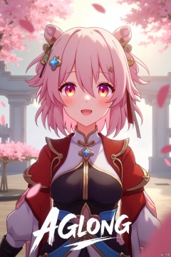 A captivating movie poster featuring a solo girl with short pink hair, bangs, and a bright smile. She wears a hair ornament, long sleeves, and fingerless gloves, all in a Chinese-inspired outfit. Pink petals float around her, creating a magical atmosphere. The scene is framed with soft, warm lighting, emphasizing her joyful expression. At the bottom center, the text AGlong is prominently displayed.