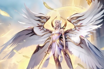1girl, solo, long hair, wings, sky, day, armor, feathers, feathered wings, angel wings, angel, pillar, multiple wings, column