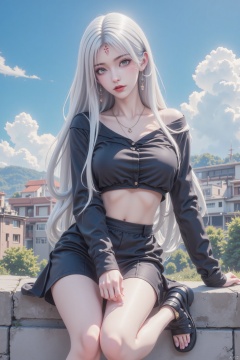 1girl, solo, long hair, breasts, looking at viewer, bangs, skirt, shirt, white hair, long sleeves, navel, jewelry, sitting, closed mouth, underwear, earrings, outdoors, sky, day, midriff, cloud, miniskirt, black skirt, necklace, black footwear, blue sky, crop top, black shirt, grass, building, pink nails, red lips,white hair,forehead mark
