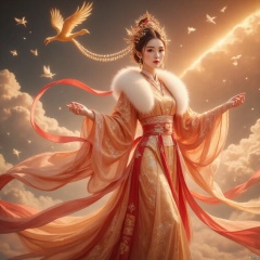 She wore a long vermilion silk dress with fine golden cloud patterns embroidered on the skirt, making her walk look like flowing sunset. There is a silk ribbon inlaid with gems tied around the waist, and pearls are shining in it, like stars dotting the waist. She wears a brocade cloak trimmed with ferret fur. The mink fur is whiter than snow, soft and has a faint luster. When the wind blows, the corners of the clothes flutter slightly, making her look very noble.