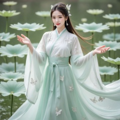 She was wearing a light green skirt, the hem of which spread out as lightly as a lotus leaf. The skirt was embroidered with delicate floral flowers and lively butterflies with silver thread. As she moved, it seemed as if butterflies were dancing among the flowers. Dance. There is a white ribbon tied around the waist, which flutters in the wind, making her figure even more graceful.