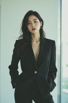 Medium shot of an Asian woman with a confident pose in a modern, minimalist setting, from head to knees. She wears a stylish, tailored suit and has a powerful gaze. LB polaroid filter adds cool tones and emphasizes her strong features. Studio lighting creates a sharp, clean look.